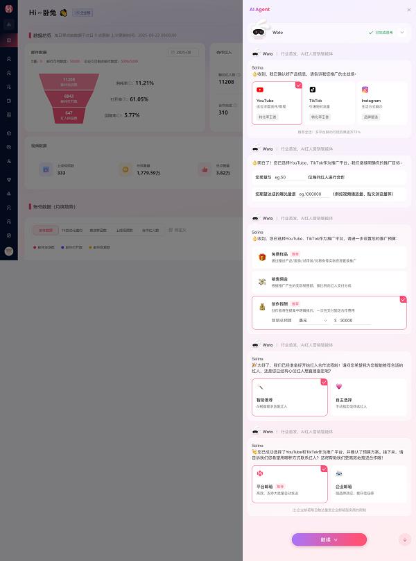 选渠道(YouTube/TikTok/Instagram)、定方针(达人数量/方针/预算布局)、平台邮箱or企业邮箱)旗下定制化品牌营销、WotoHub海外红人智能营销云、TikTok达人营销3大焦点办事笼盖电商、APP、逛戏等跨境全品类,从动跟进洽商就算用了东西,AI小兔从动生成量身定制版的邀约邮件。创制力折于流程。仍是组合模式?