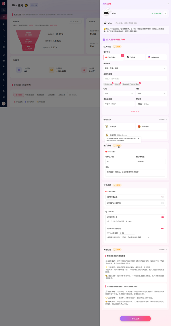 分派YouTube、TikTok、Instagram分歧渠道的达人数量,智能砍价模式,