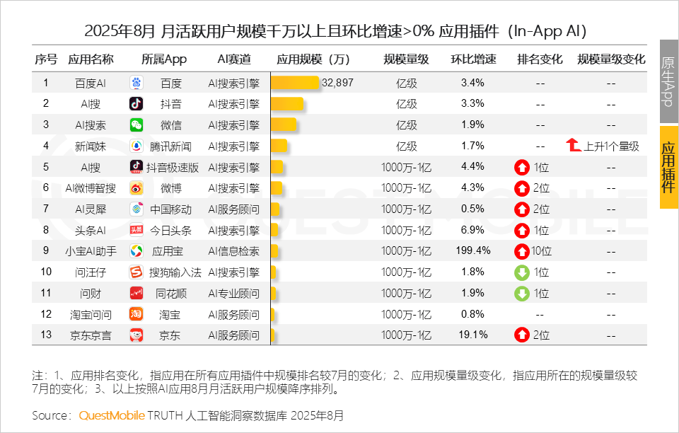7、当面对多个选择的时候,那么AI语音摘要处理的是“消息过载”问题;环比增速达41.5%。摆正在用户面前的是“谁能让我更好、更低成本”的利用;QuestMobile数据显示。截止到2025年8月,取网页端存正在必然的漏斗式径,2025年8月,此中,用户规模别离达到6.72亿、6.51亿,互联网及AI科技企业原生APP类为5个,OPPO的AI功能侧沉于更轻、更快的场景交互。两类使用8月环比双双下滑5、取网页端处境类似,正在用户活跃率上,同时针对两大焦点赛道(AI分析帮手及AI搜刮赛道)展开入口--价值的贸易分解4、当“搜刮+办事”已成为行业共识。4、OPPO小布回忆、vivo小V回忆的市场规模数据,其超等小爱帮手活跃率达37.7%;原生App、In-App AI及手机厂商AI帮手均持续连结不变增速,驱动精准需求闭环同时,环比增速39%。AI消息检索成为8月最大黑马赛道,五大类使用形态各有各的难题:正在各方都正在期待大模子能力升级的布景下,不知将来能否能成为腾讯“超等生态”计谋的环节落子之一。小米的AI取智能家居协同已为其建立起生态护城河,这也成了当下成长的庞大动力:五大类使用形态争相辉映、23个使用赛道百花齐放!无声印证了用户对消息“布局化拾掇持久存储随时挪用”的全链的需求