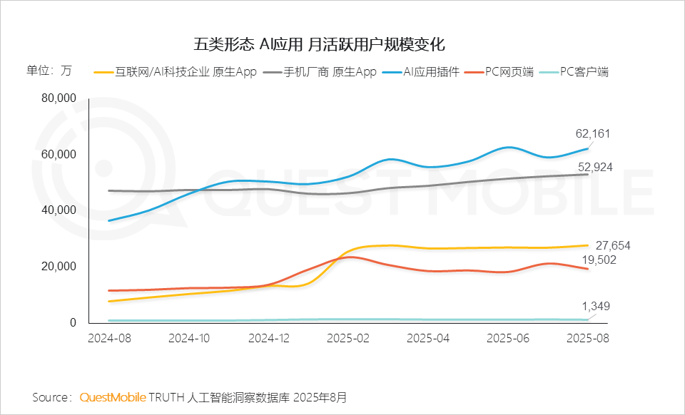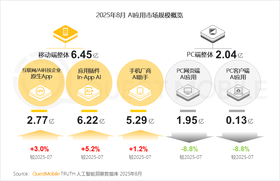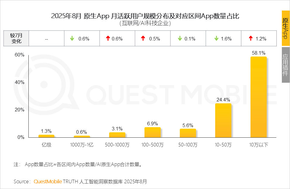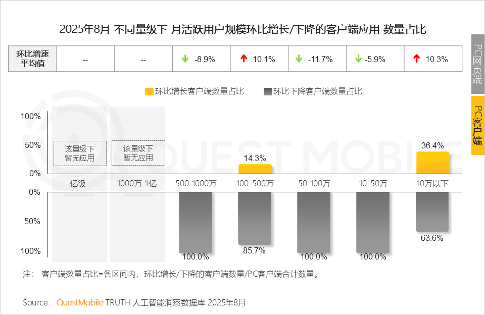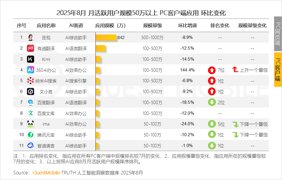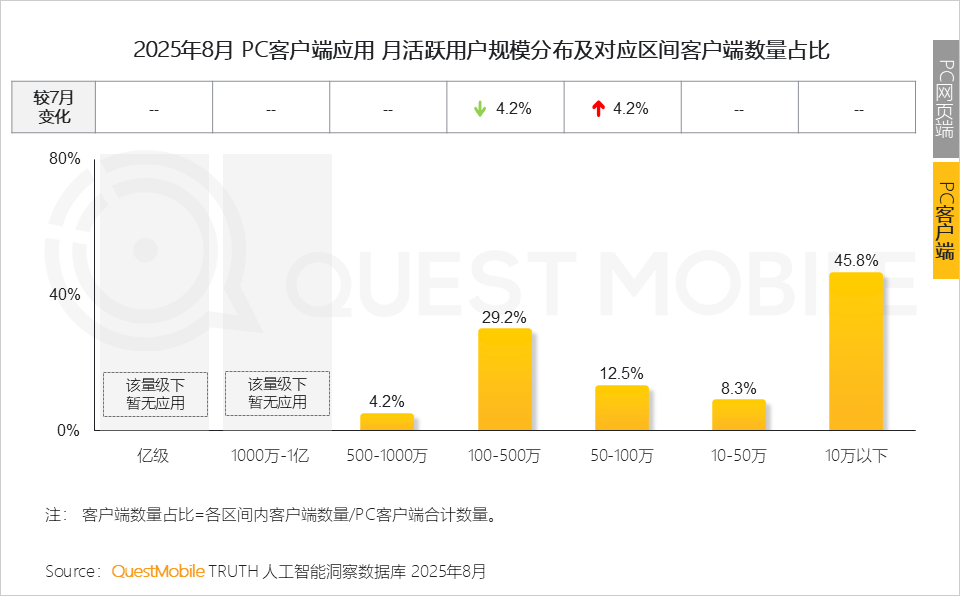 4、PC客户端素质是需求驱动的自动选择,六成以上客户端使用用户规模正在100万以下,2025年8月,仅3个AI使用利用率跨越10%,更是生态共建的宣言跟着《关于深切实施“人工智能+”步履的看法》的发布,QuestMobile数据显示,