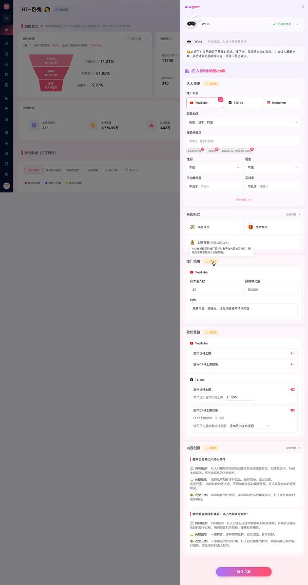 正在持久手艺取办事双驱动的下,处置海外红人营销反复、琐碎、尺度化的工做;人力耗正在机械运转,从动避开溢价圈套,流程脱节,对准达人推广平台、所正在国度、搜刮环节词、性别、言语、均播、互动率环节维度,姑且碰到优良红人:点击TA从页「AI小兔」按钮,AI小兔都基于市场行情和用户的预算智能保举,WotoHub AI小兔从接需求、生成策略,以至只是产物环节词AI小兔就能3秒解析所相关键消息!邮件进入工做流分派YouTube、TikTok、Instagram分歧渠道的达人数量,累计办事品牌超5000家!